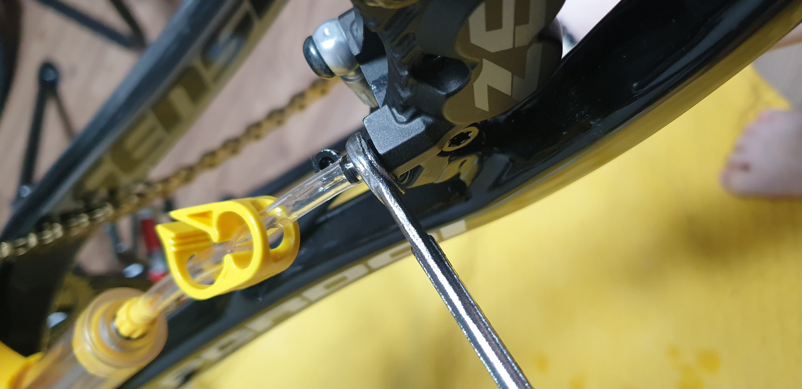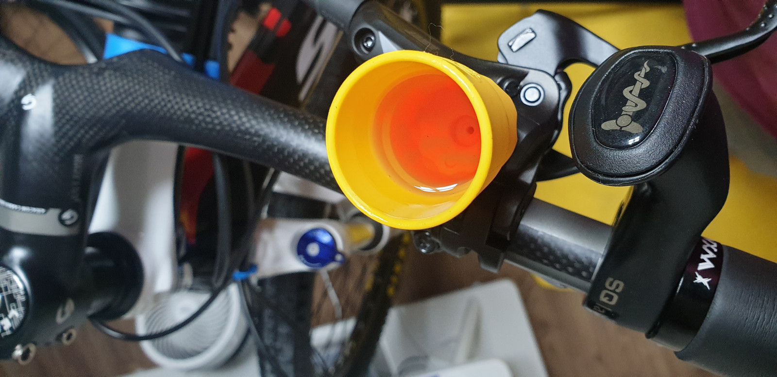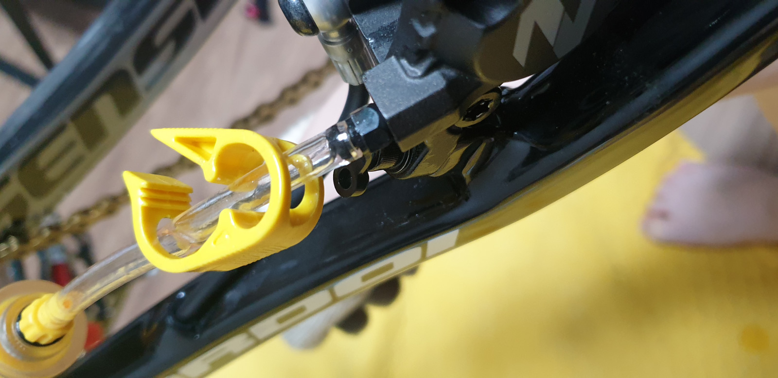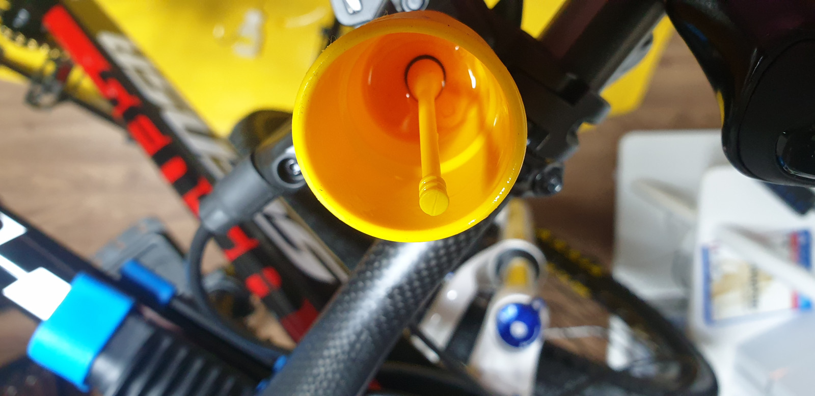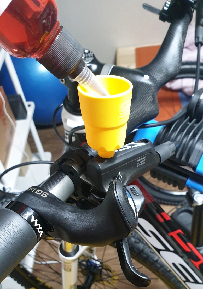 이 브레이크는 깔때기를 장착하지 못하니 오일이 흘러내리지 않게 수평으로 브레이크를 맞춰주고 캡을 분리해야한다.