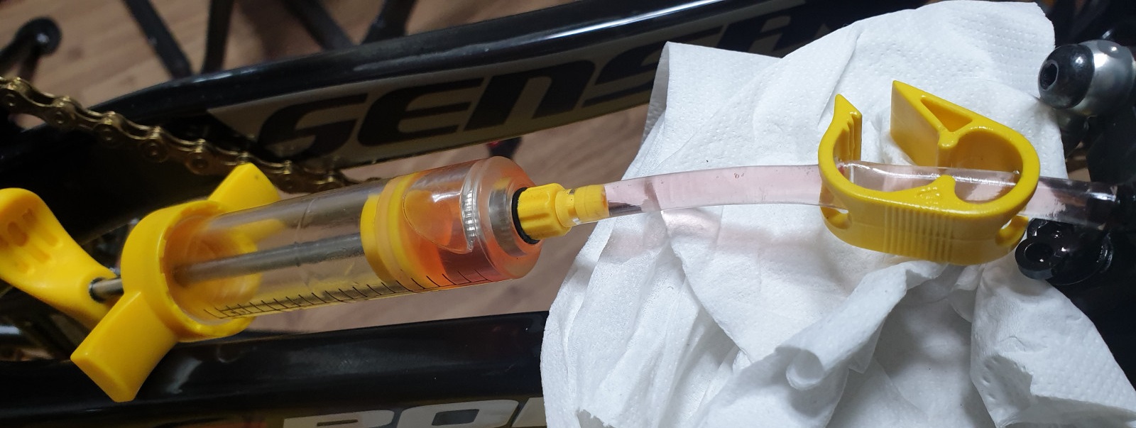 브레이크 레버의 깔때기의 오일 잔량을 확인하면서 오일이 없어지지 않을정도로만 주사기를 당겨준다.