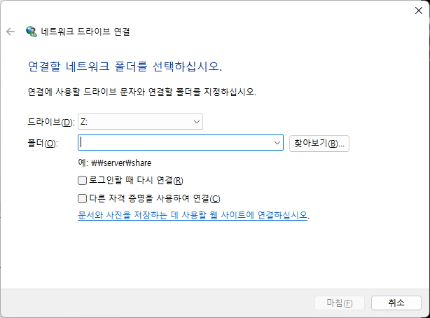 내 PC - 컴퓨터 탭 - 네트워크 드라이브 연결 - 폴더 상자에 주소 입력