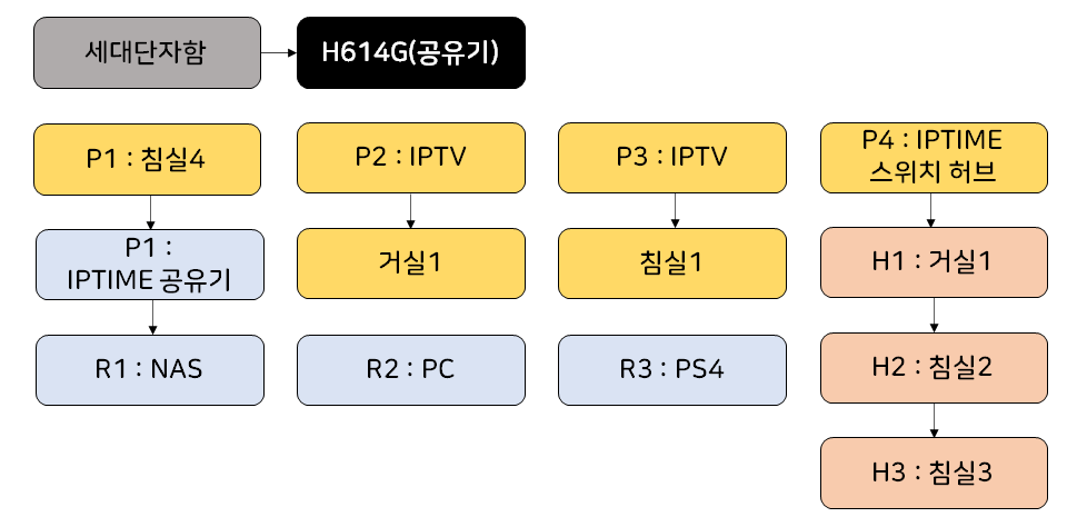 P1에 연결된 IPTIME 공유기의 LAN 포트 R1 / R2 / R3 / R4 에 침실4 / 거실1 / 침실2 / 침실3의 랜선을 연결한 뒤