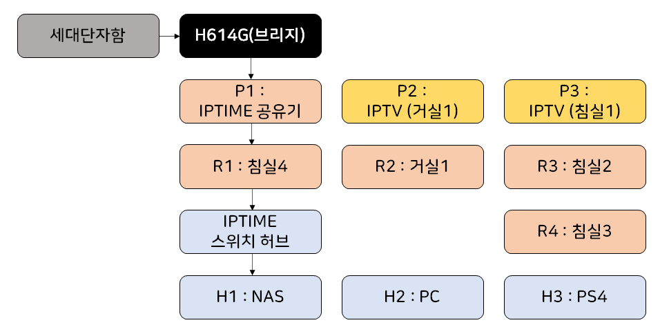 네트워크망은 H614G - IPTIME 공유기 - 침실1 / 침실2 / 침실3 / 침실4 / 거실1 / NAS / PC / PS4