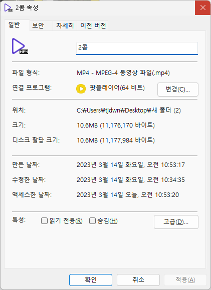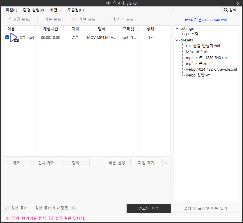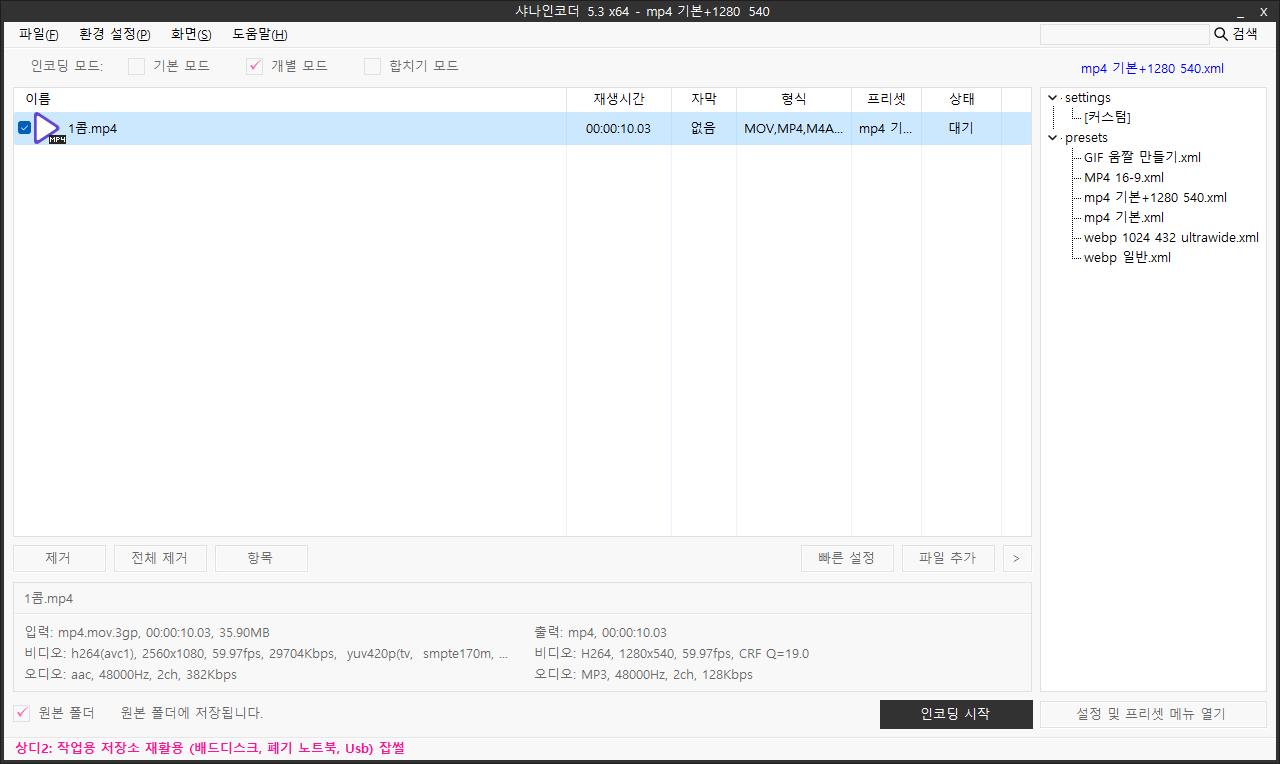 인코딩 시작버튼을 눌러 인코딩 후 다시 드롭