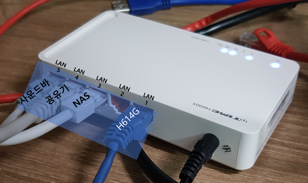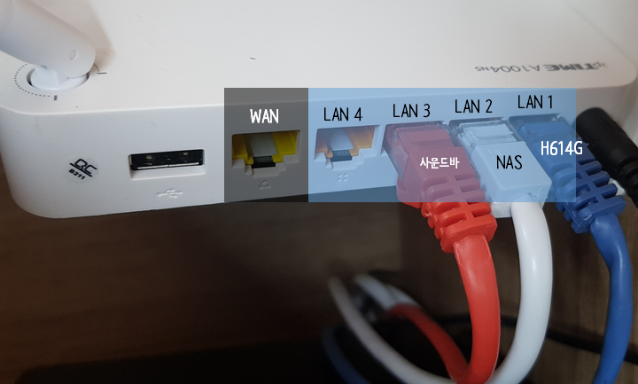 IPTIME 공유기의 WAN포트에는 아무것도 꽂지말고, LAN포트에 SK H614G에 연결된 선(매립선)을 꽂는다