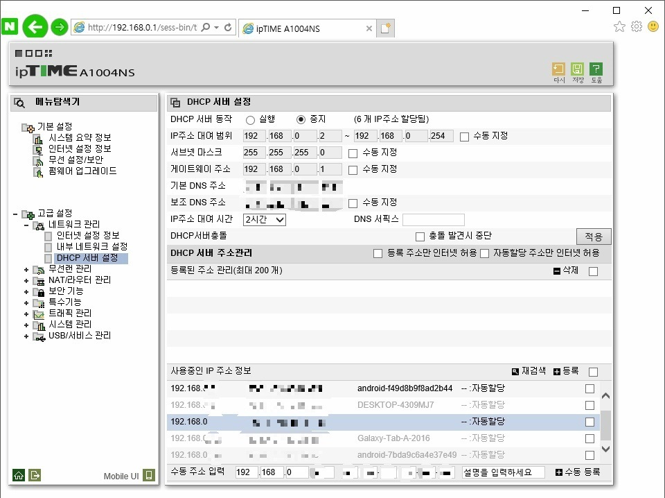 메뉴 탐색기 - 고급설정 - 네트워크 관리 - DHCP 서버 설정 - DHCP 서버 동작에 중지 체크