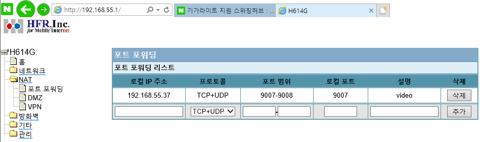 좌측 메뉴탭 - NAT 클릭 - 포트 포워딩 클릭