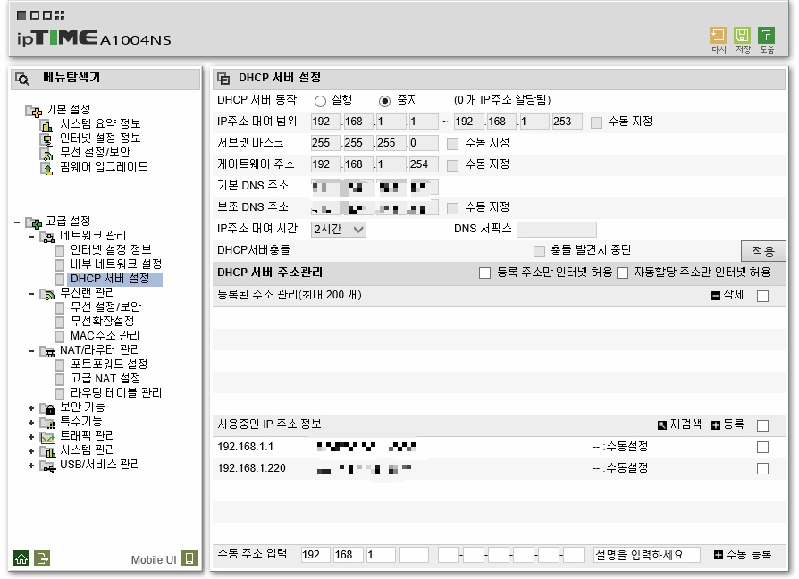 고급설정 - 네트워크 관리 - DHCP 서버 설정을 클릭 후