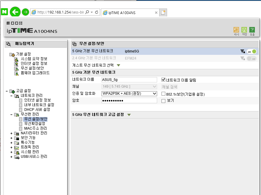 고급 설정 - 무선랜 관리 - 무선 설정/보안