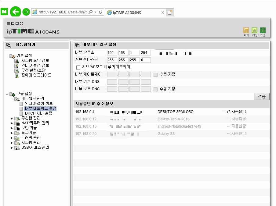 (아이피타임공유기의 경우 : 고급설정 - 네트워크 관리 - 내부 네트워크 설정)
