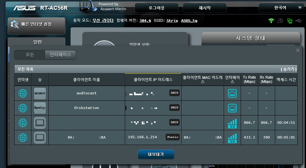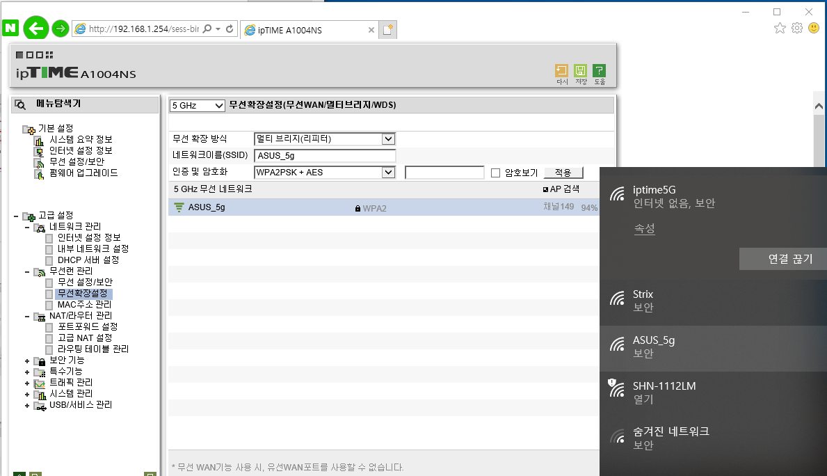 ASUS_5g에 무선 브리지로 연결됨(수신감도 : 100%)