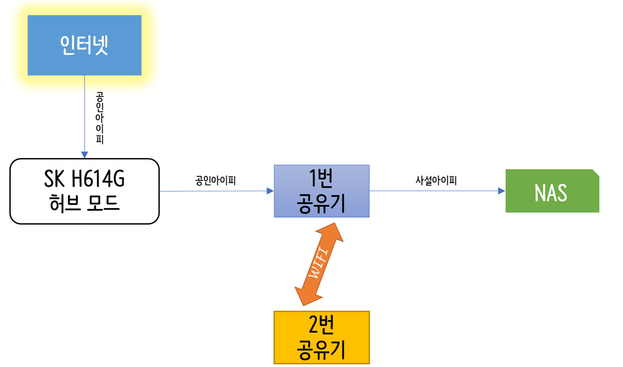 내가 하고 싶은 건 2번 공유기에 접속한 상태에서 1번 공유기에 물려있는 NAS에 접속하고 싶은데