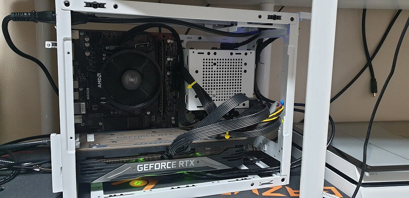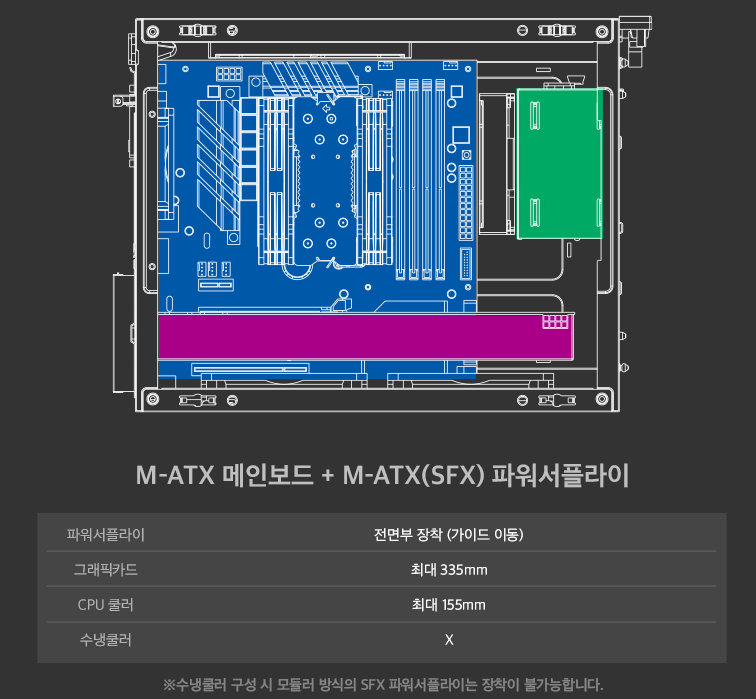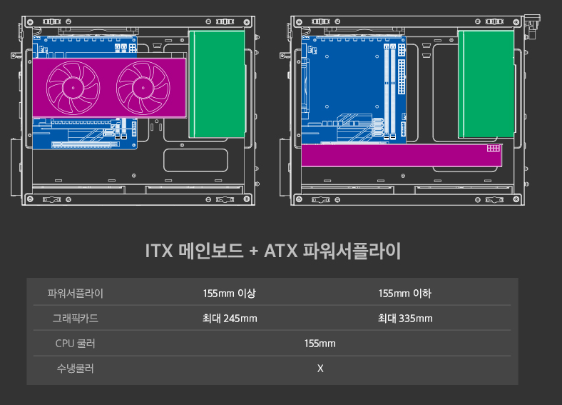 이러한 시스템 조합에 대해서 소개되는데 측면 그래픽카드 장착시 ATX 파워서플라이의 경우 그래픽카드가 245mm로 제한되고. SFX 파워서플라이의 경우 그래픽카드 335mm까지 장착가능하다. 또 설명에는 측면에 그래픽카드를 장착할때 수냉쿨러 장착이 안되는 것 처럼 설명이 되어있지만