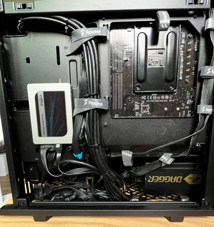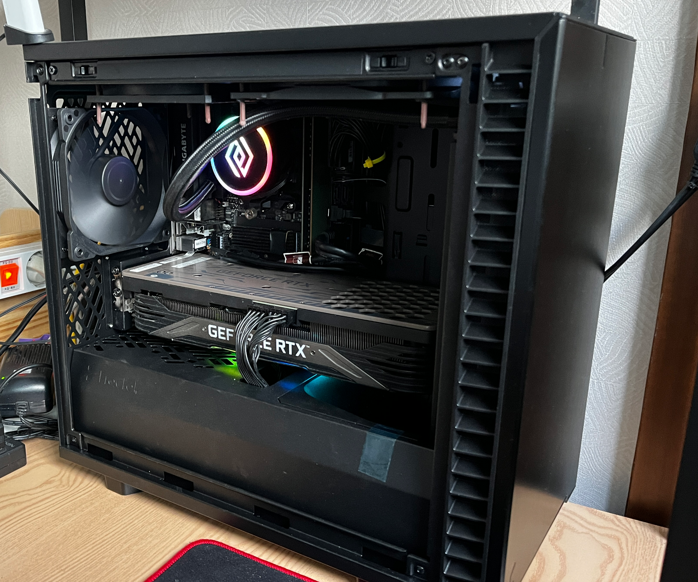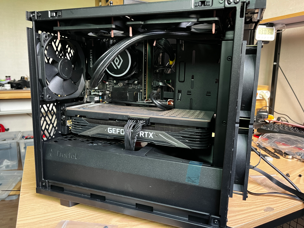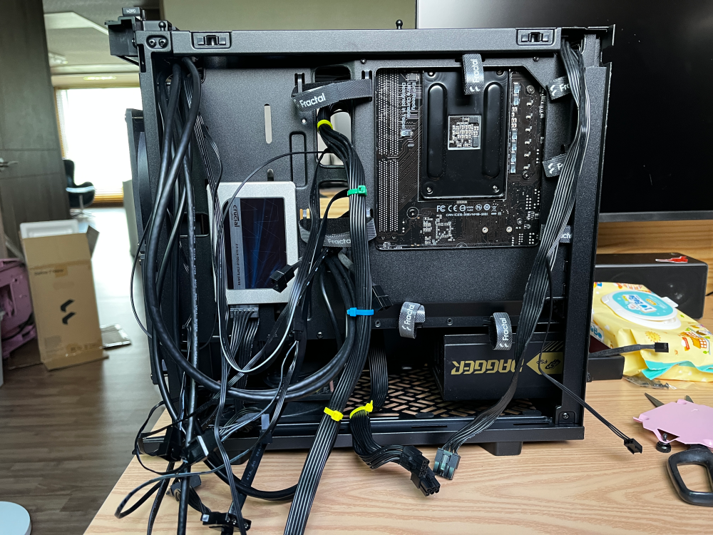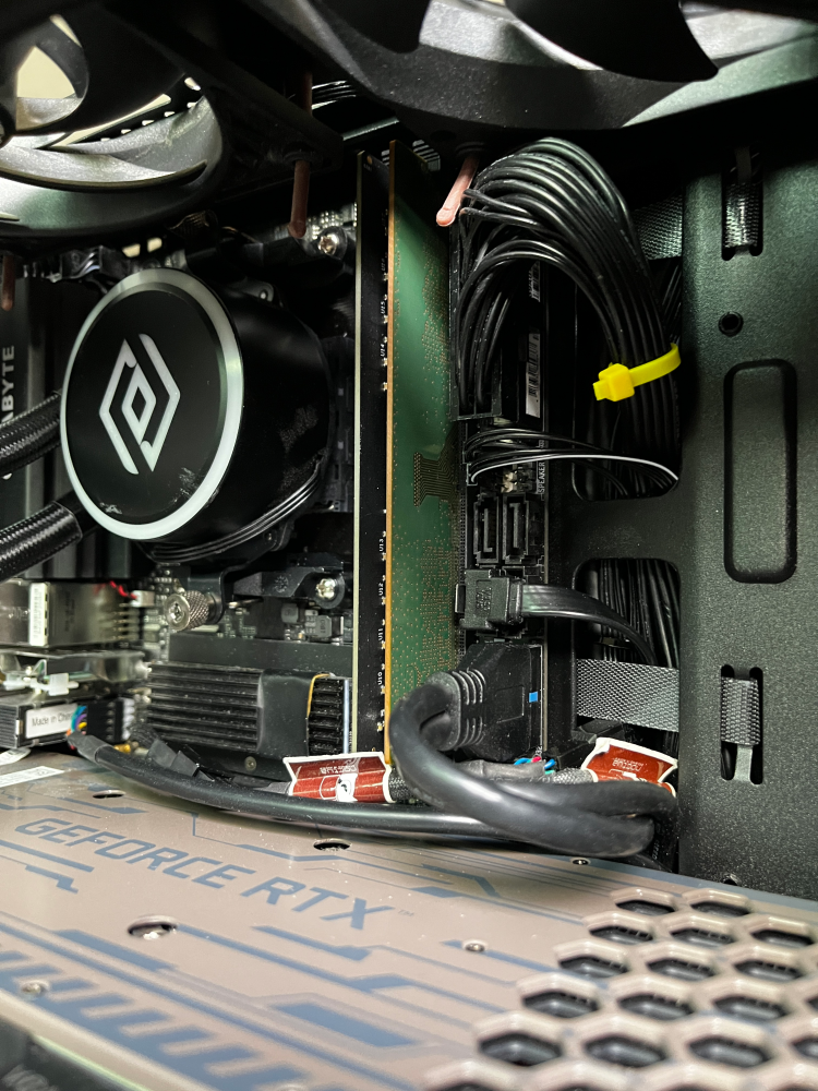 그래픽 카드 때문에 공간이 안 나와서 케이스 앞쪽에 노출시켜서 장착했다. 커버는 제대로 닫히나 쿨링성능에 제한이 있을 듯... 하나 극한의 환경까지 CPU 온도를 생각할 만한 시스템이 아니며 오버클럭도 하지 않기 때문에 문제는 없다.