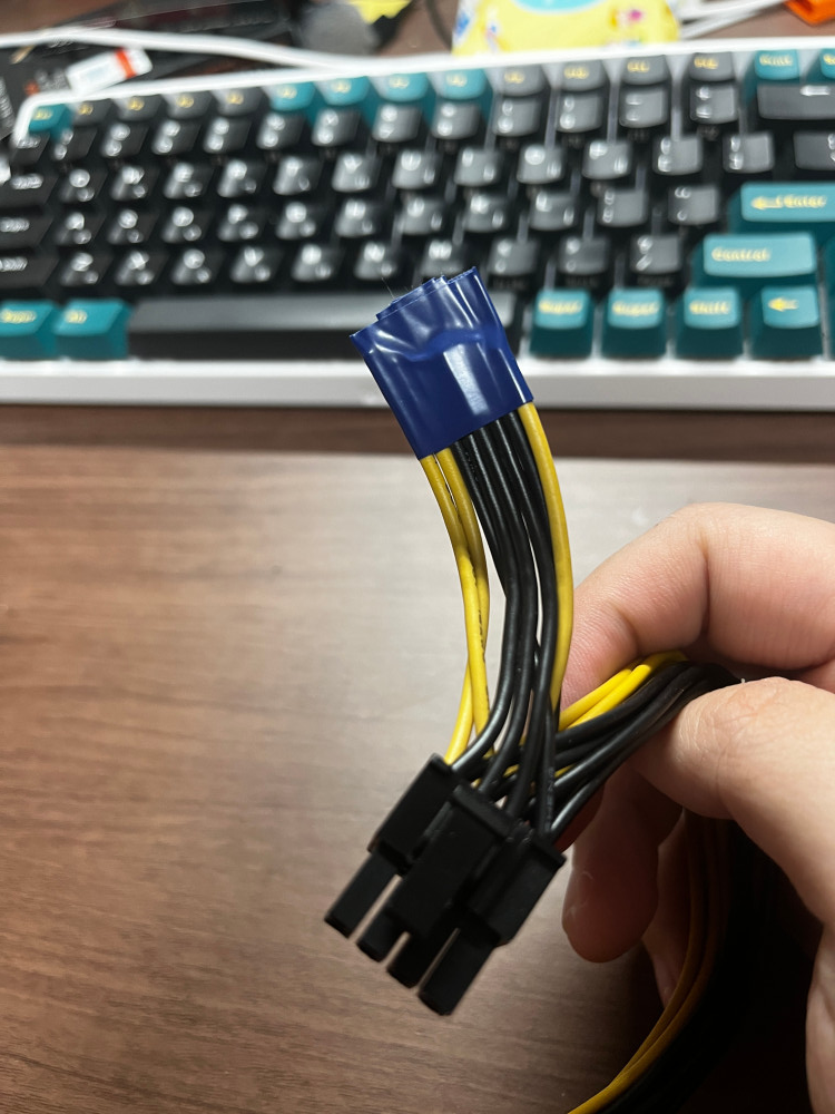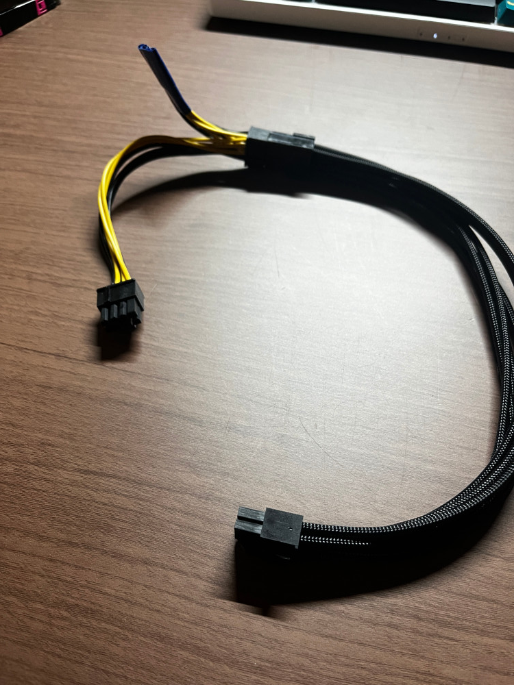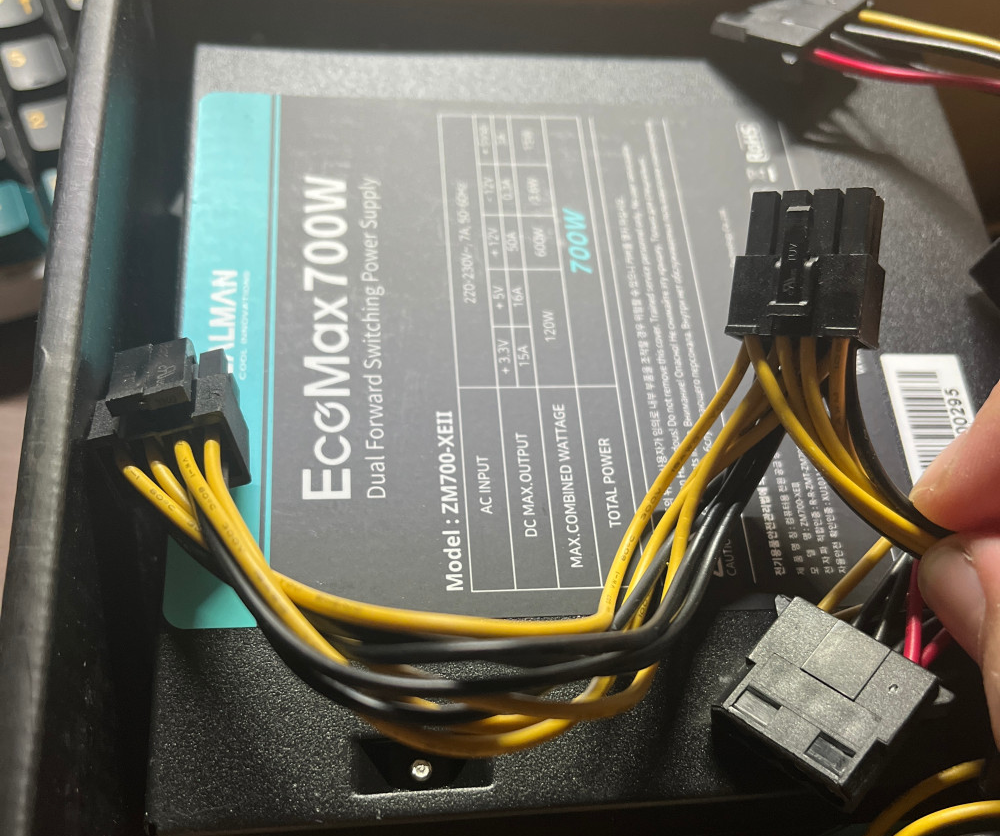 그래서 안쓰는 파워에서 8핀 M to M을 자른다. 현재 몰렉스 핀을 뽑는 공구가 없기 때문에 깔끔하게 만들지는 못하고 절연테이프로 대충 마감을 한 뒤 연장 케이블을 사용해 길이를 연장한다.