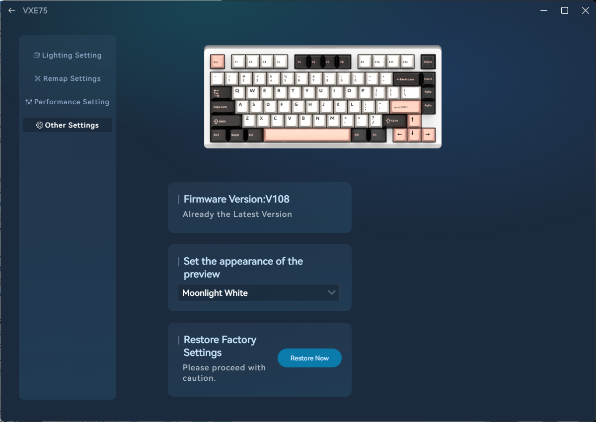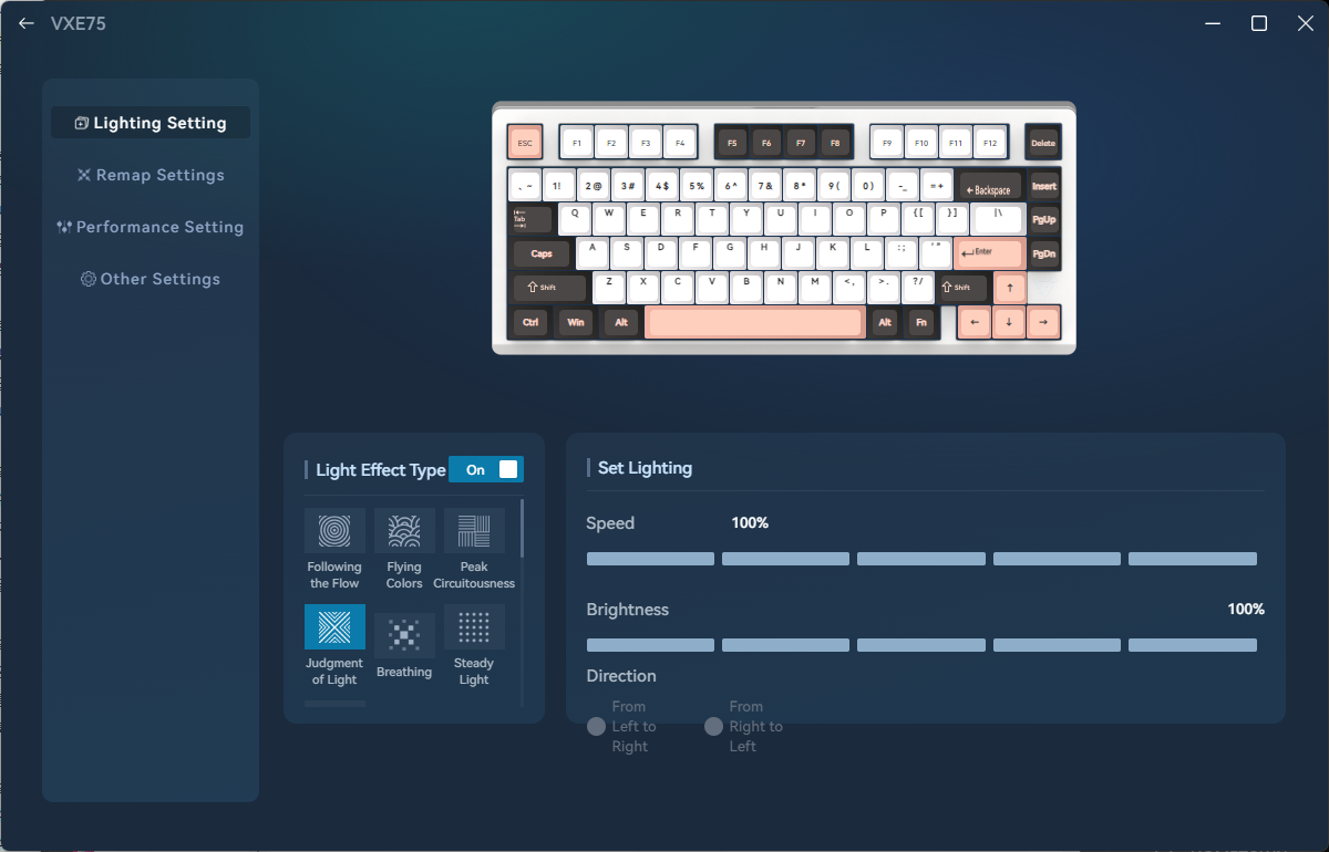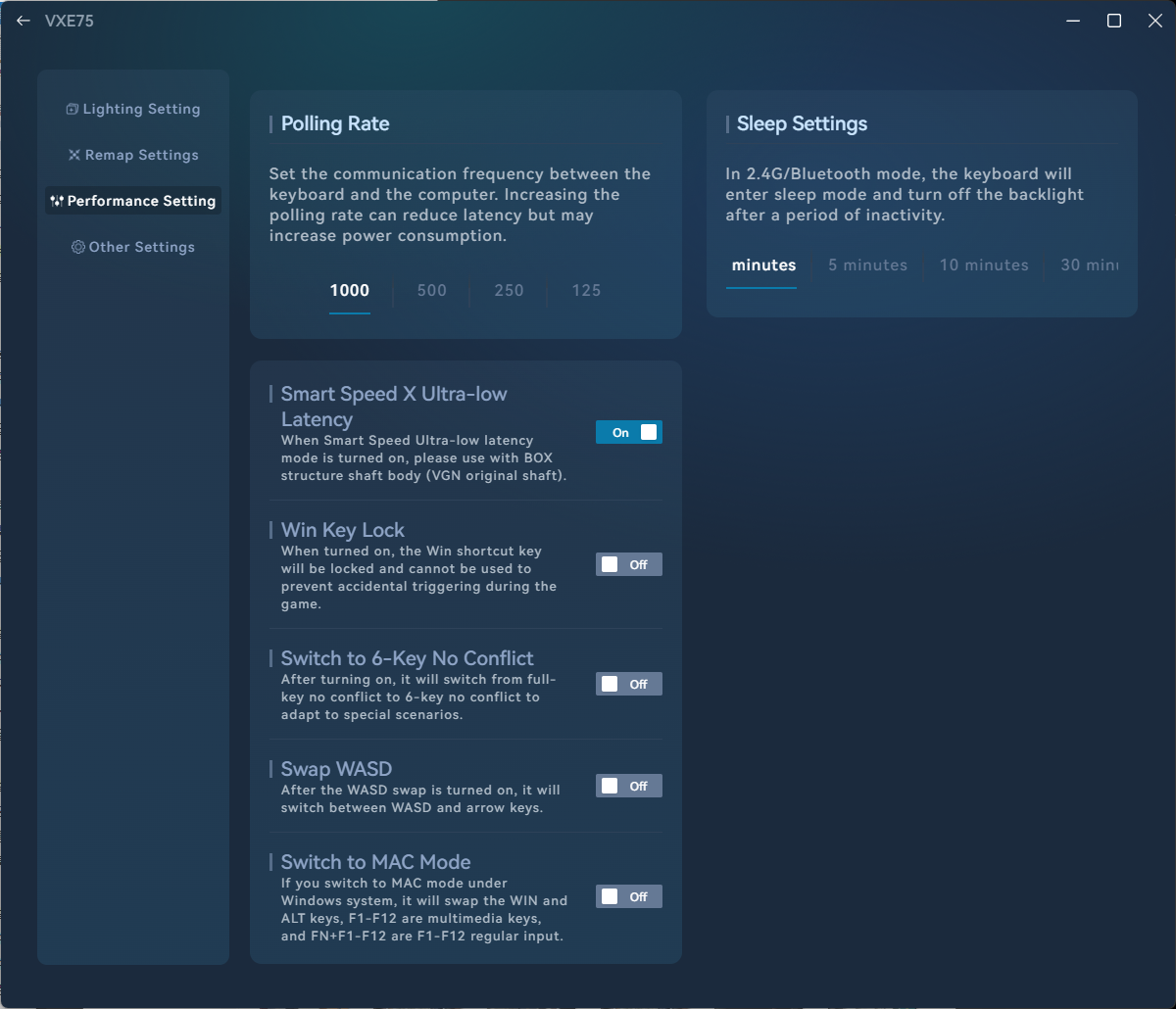 성능에 대한 설정도 가능하다. 폴링레이트, 레이턴시, 윈도우 락, WASD 방향키 전환, N키-6 키 전환, MAC 모드, 슬립 등 다양한 모드가 지원.