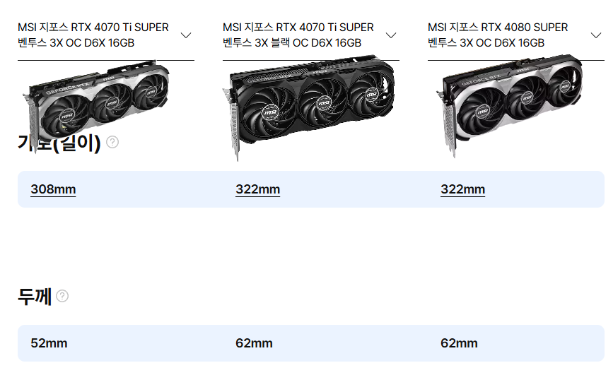 현재 내 환경은 트리플 모니터 세팅이라, 단순히 성능이 좋은 카드보다는 VRAM이 넉넉한 카드가 필요했고, 고민 끝에 선택지는 세가지로 좁혀졌다.