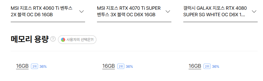 현재 내 환경은 트리플 모니터 세팅이라, 단순히 성능이 좋은 카드보다는 VRAM이 넉넉한 카드가 필요했고, 고민 끝에 선택지는 세가지로 좁혀졌다.