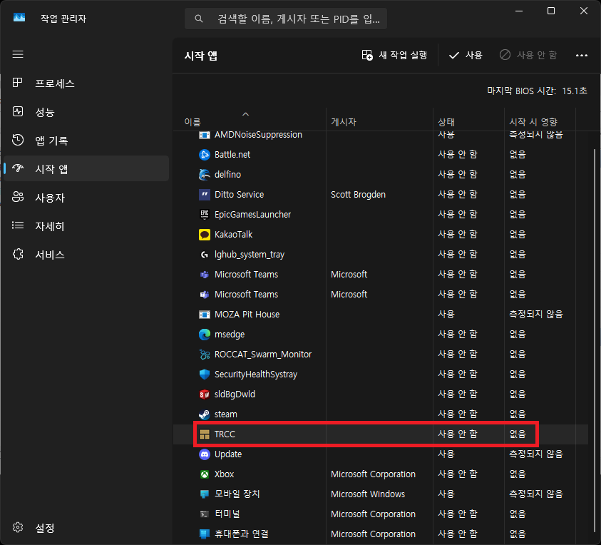 작업 관리자 - 시작 프로그램에서 해당 프로그램을 사용안함으로 설정