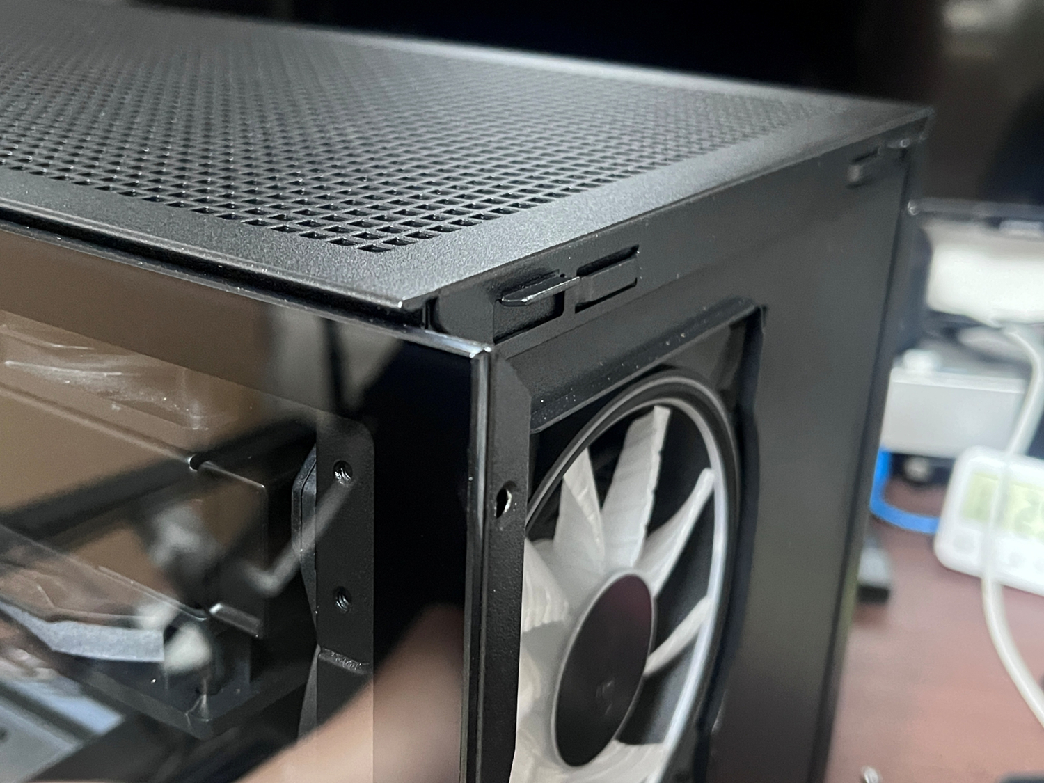 브라켓이 없더라도 하단 먼지 필터를 제거하고 메쉬망을 통해 팬을 설치할 수 있을 것 같음.