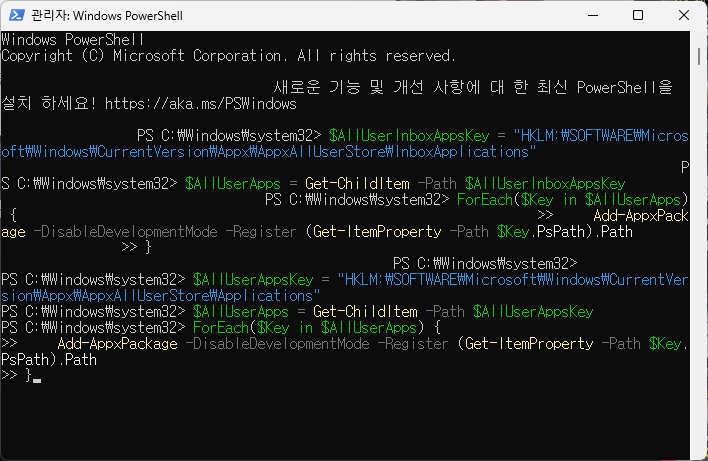 Add-AppxPackage -DisableDevelopmentMode -Register (Get-ItemProperty -Path $Key.PsPath).Path